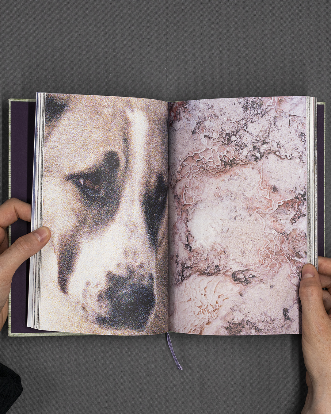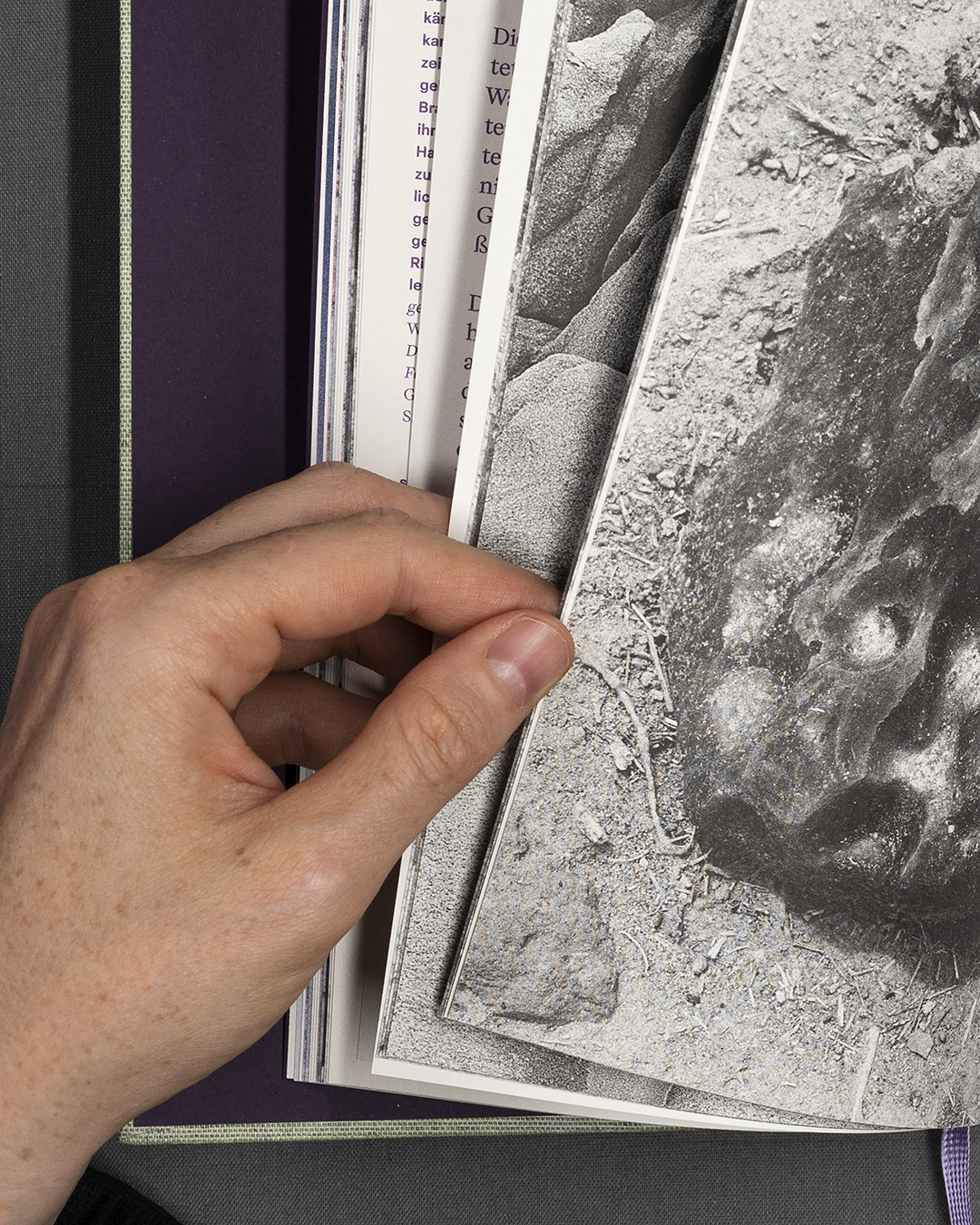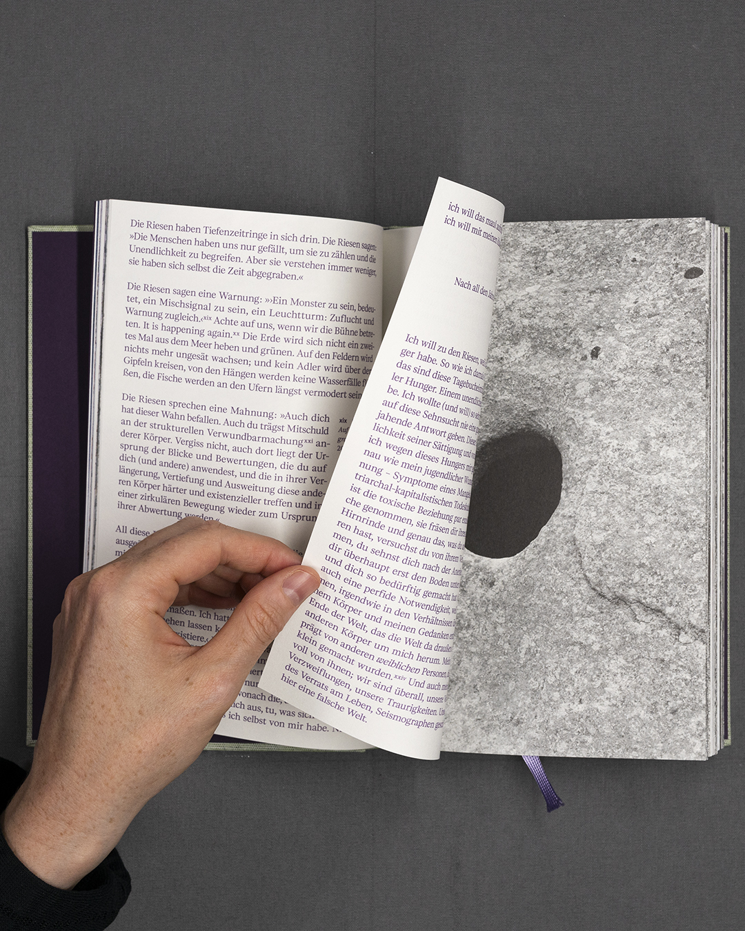 Die überbordende Kraft dieses Essays wird von atmosphärischen Fotografien aufgefangen: Auf ganz- und doppelseitigen Sujets dürfen die Wogen der Worte bildlich branden und nachklingen. Steine und Felsen, deren Oberflächen und Formationen, schlagen zugleich eine visuelle Brücke zur imaginären Lebenswelt der Riesen. Eingebettet in ein harmonisches Farbkonzept, werden die Schroffheit und Wildheit ihrer Texte wiederum haptisch mit dem griffigen Leineneinband und dem durchdachten Layout vermittelt. Der unkonventionelle Umgang mit Fußnoten sowie der spielerische Satz spiegeln zudem die Zerrissenheit und den Kampf gegensätzlicher Gefühle wider.